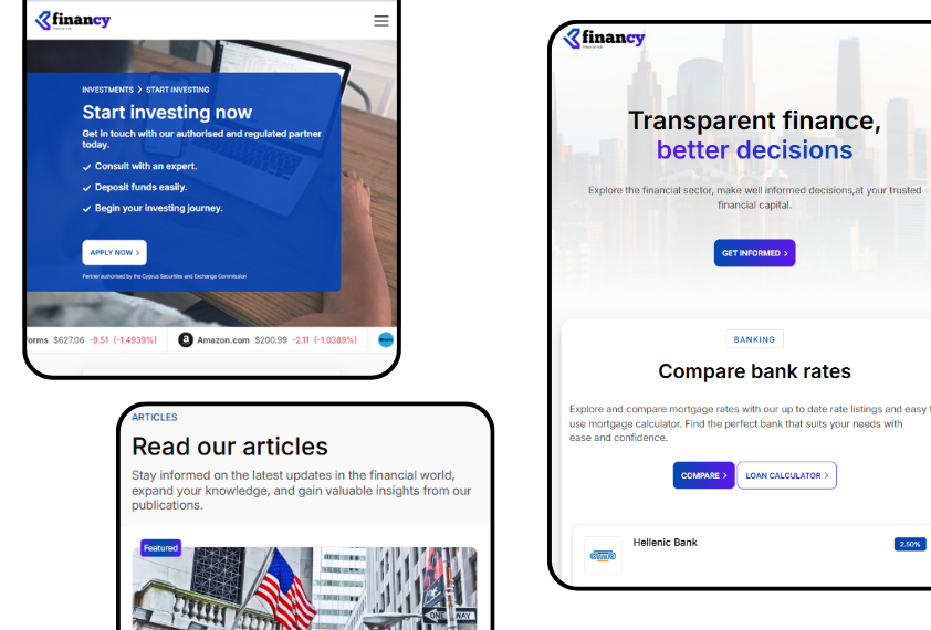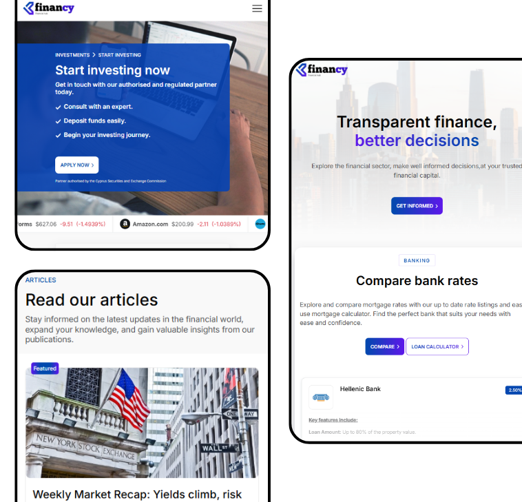 Designed a user-friendly website for Financy, a premier platform for news, banking, and financial advice. The site includes loan calculators with analytics charts, contact forms, a banking section with detailed information, and useful financial articles. The project provides users with essential tools and insights for financial planning and decision-making.